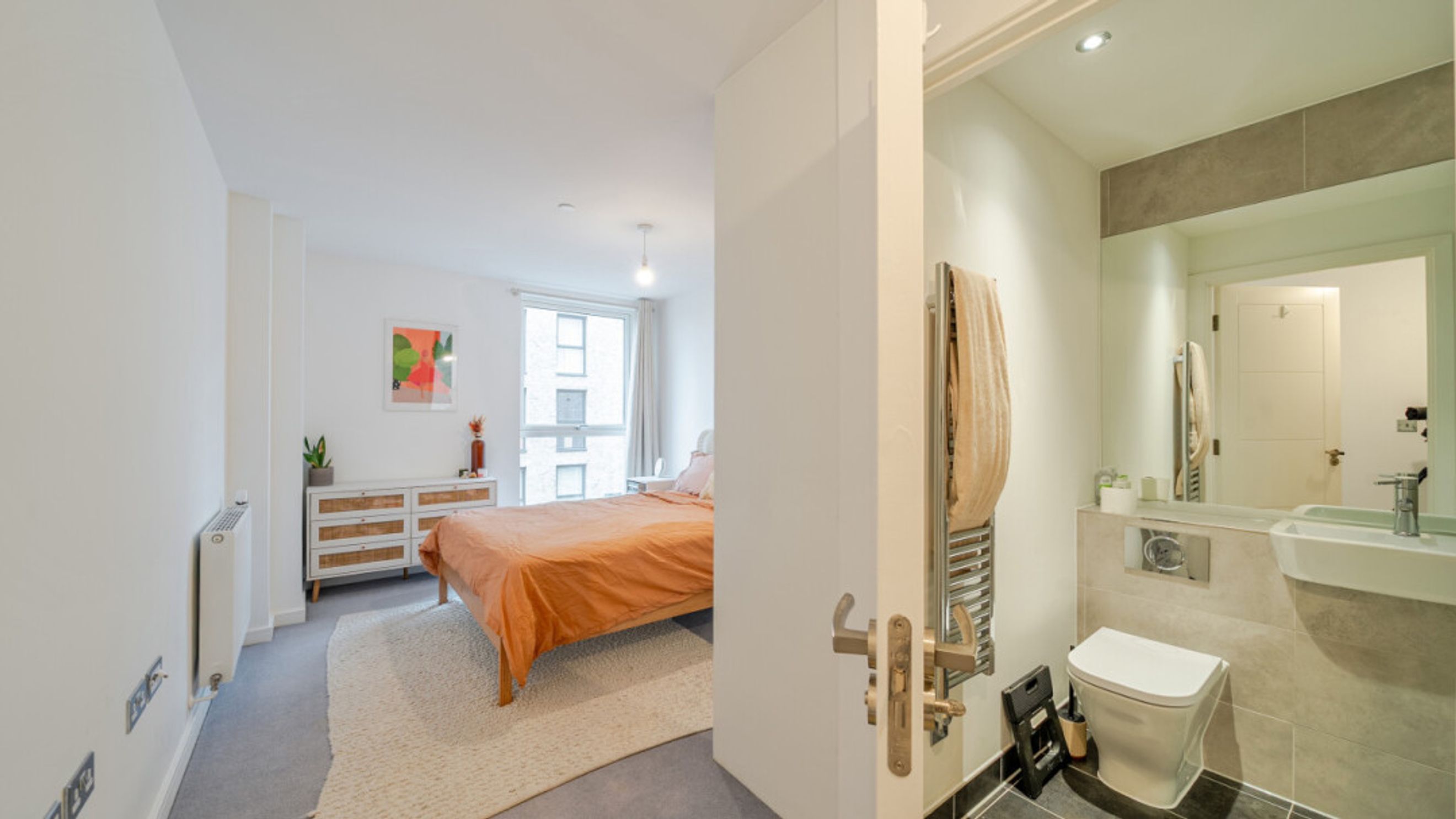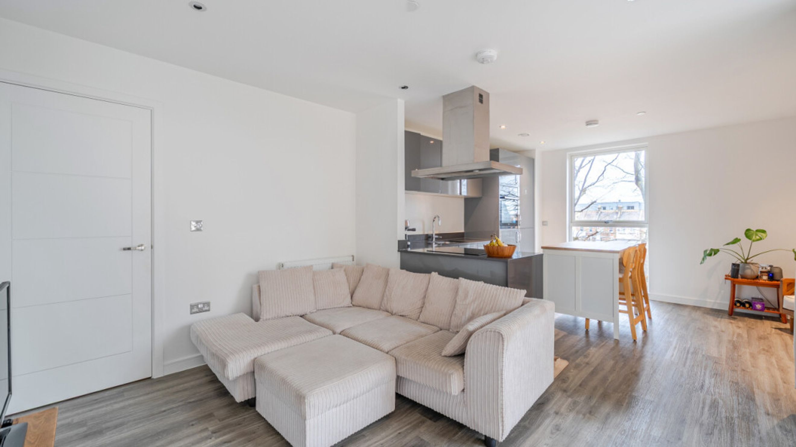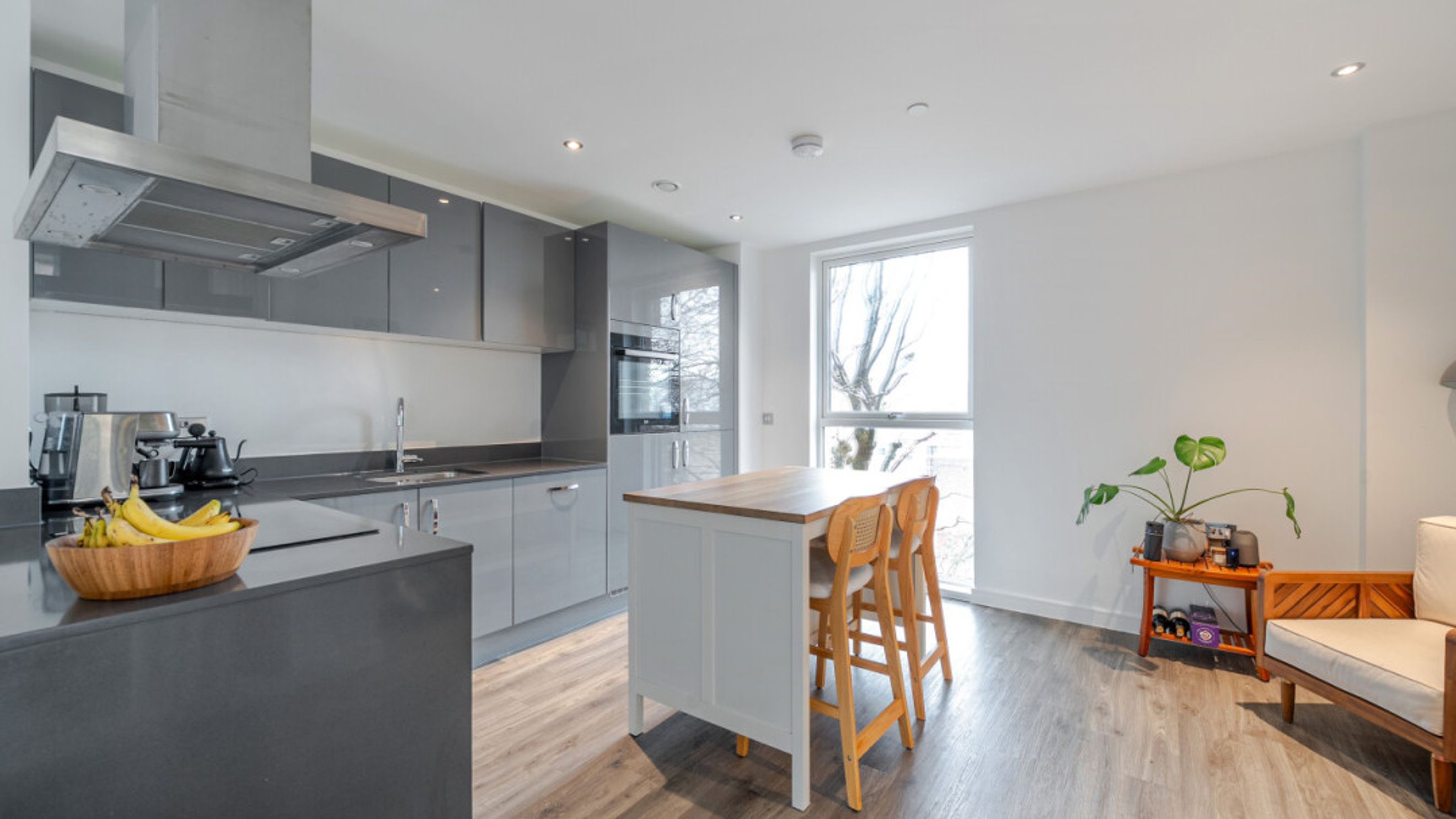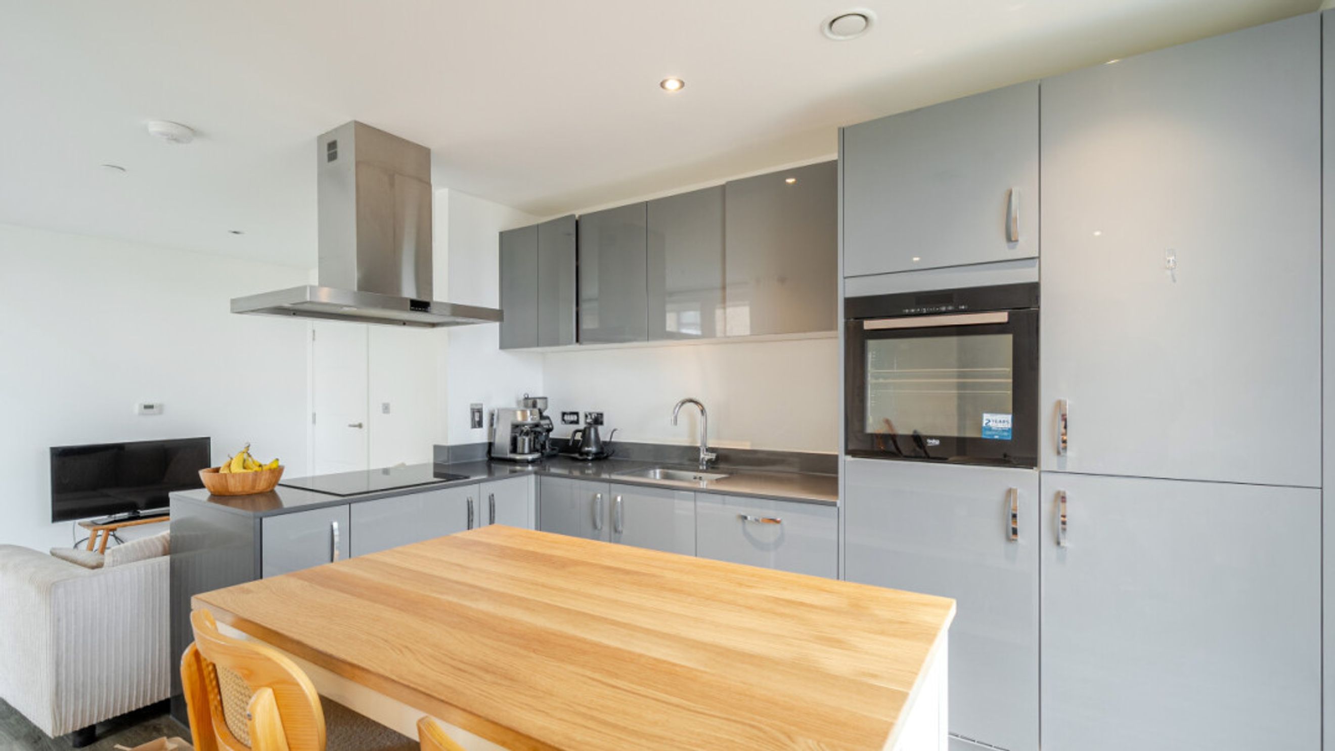 Enter this apartment via a bright and spacious hallway with storage, including a utility cupboard. A dual aspect open plan reception area leads onto a balcony that accommodates a large sofa. The modern kitchen is fitted with high gloss units and includes fully integrated appliances. There are two generous double bedrooms, each with in-built storage. The master includes an en-suite shower room and a contemporary bathroom serves the second bedroom.