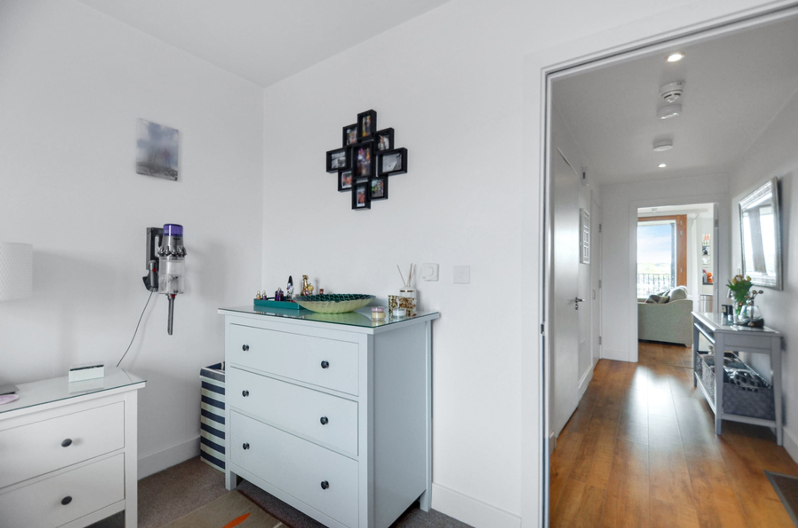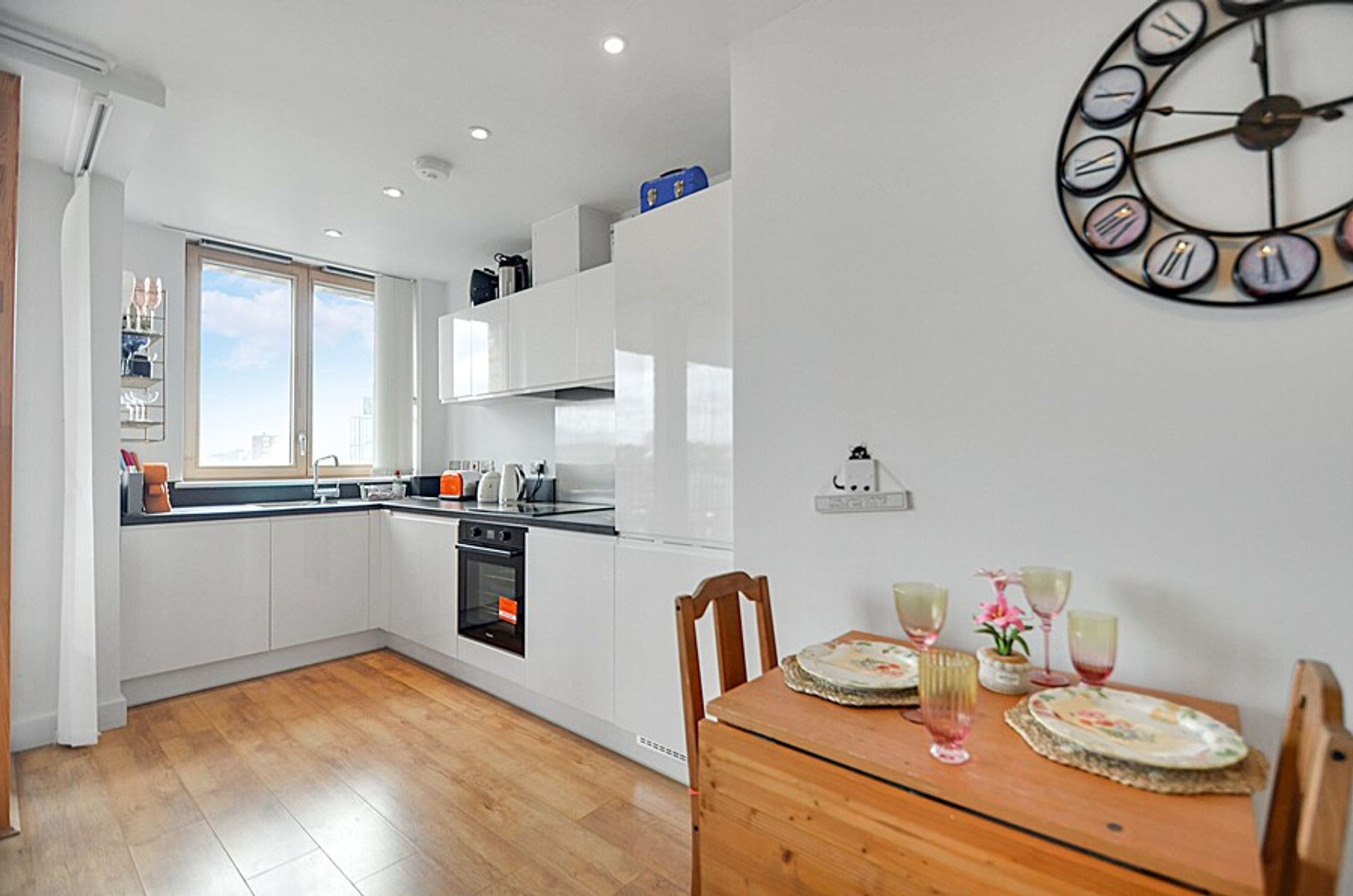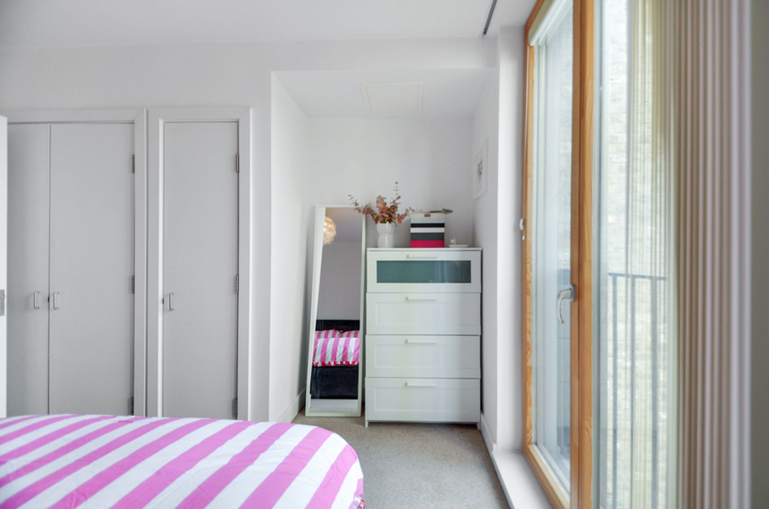 This home features a well-sized bedroom with a fitted wardrobe, an open-plan living area, and a modern kitchen with integrated appliances. Floor-to-ceiling windows fill the apartment with natural light, while central heating and access to a communal garden enhance everyday comfort.