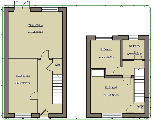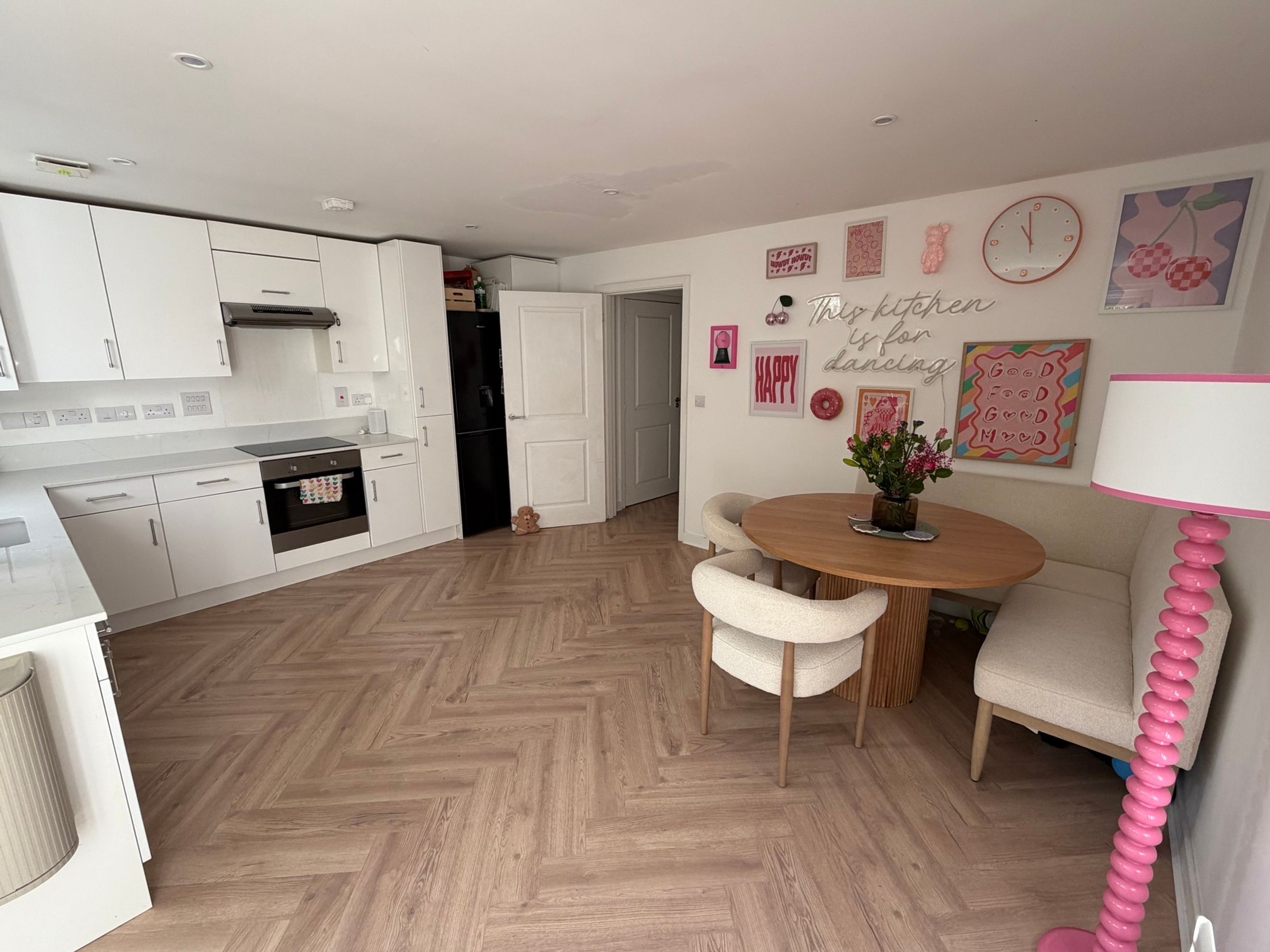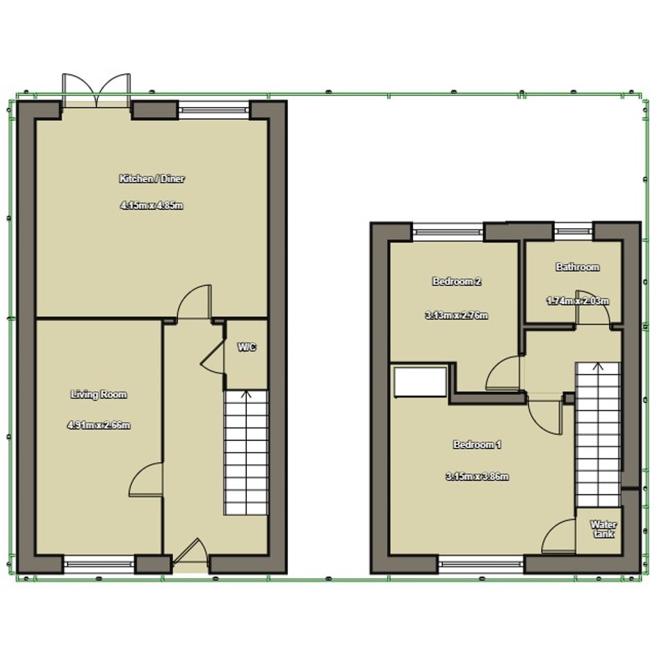 The ground floor offers a practical layout including a kitchen/diner with integrated oven, hob and extractor fan, a downstairs WC, and a useful under-stairs storage cupboard. Upstairs are two bedrooms and a family bathroom.