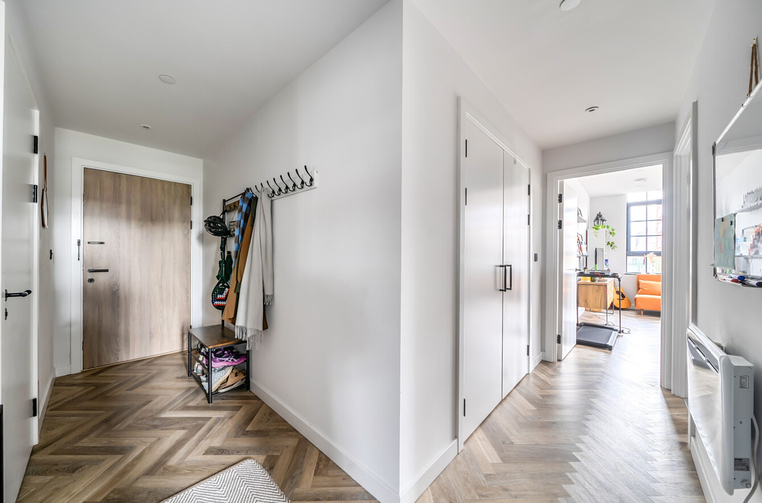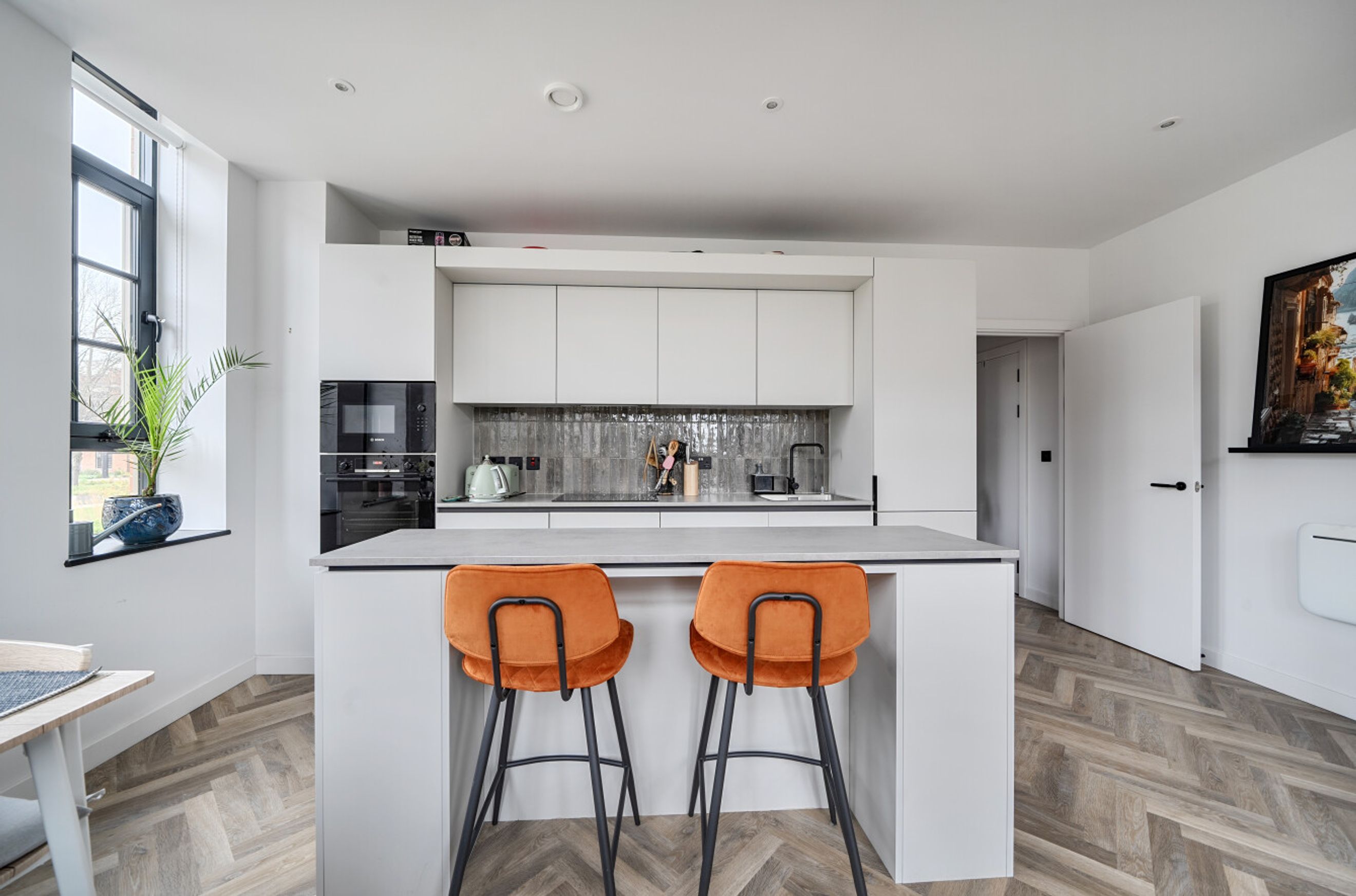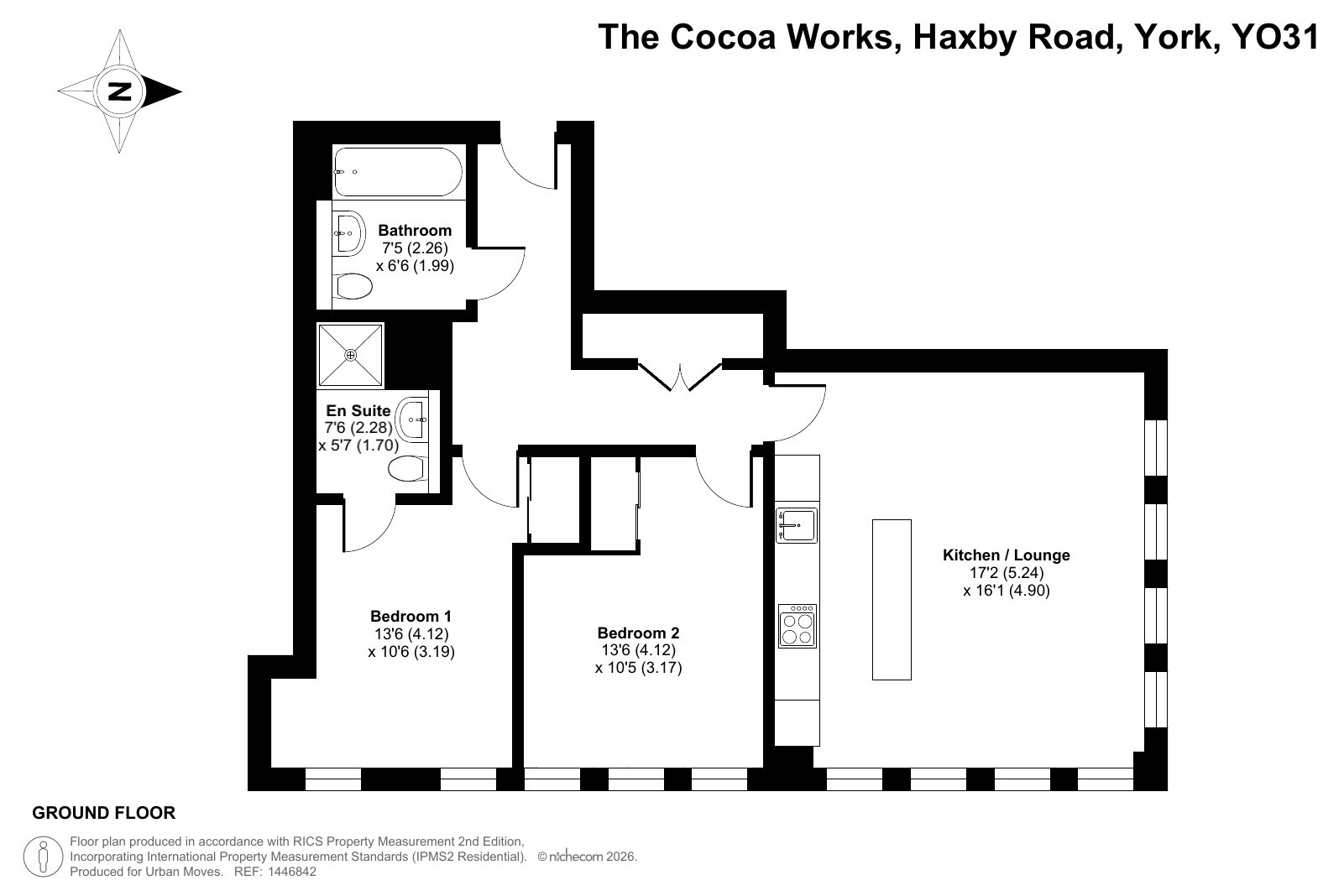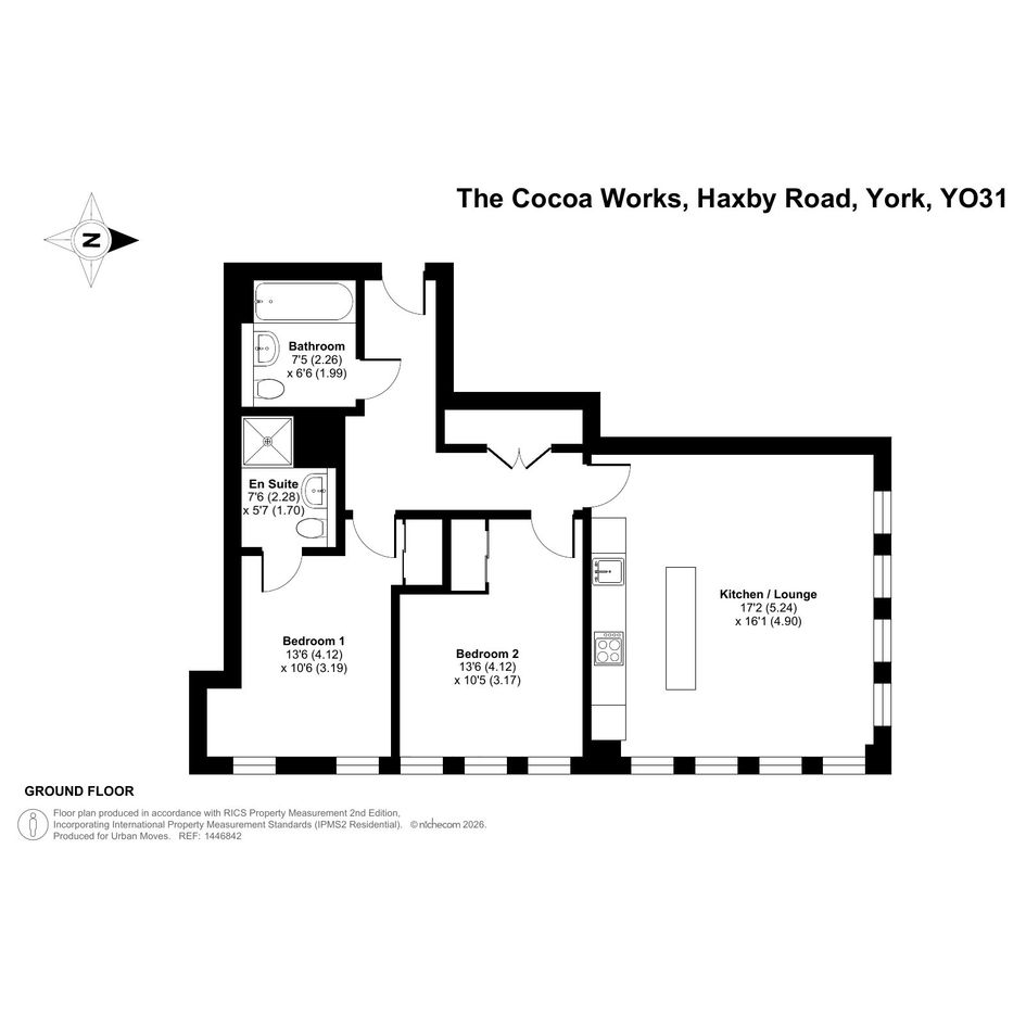 An attractively-presented apartment in the recently-converted Rowntree chocolate factory. The ground-floor property has a dual-aspect reception room with herringbone flooring and no less than eight warehouse-style windows. The open-plan kitchen features an island unit/breakfast bar and integrated appliances. There are two good-sized double bedrooms. Both include a fitted wardrobe and one is en-suite to a high-spec shower room. The hallway provides access to the smart, modern bathroom as well as to a large storage/utility cupboard. Well insulated walls and floor combined with high-performance glazing make for a good energy-efficiency rating. There is a coffee shop/restaurant within the well-kept grounds of The Cocoa Works and a residents' library and co-working space in the concierge building. York city centre can be easily reached on foot, via bus or by brief cycle ride. Haxby Road Primary School, which is just a few minutes walk away, is Ofsted-rated 'Good' and there are several other well-thought-of schools, primary and secondary, in the local area.
