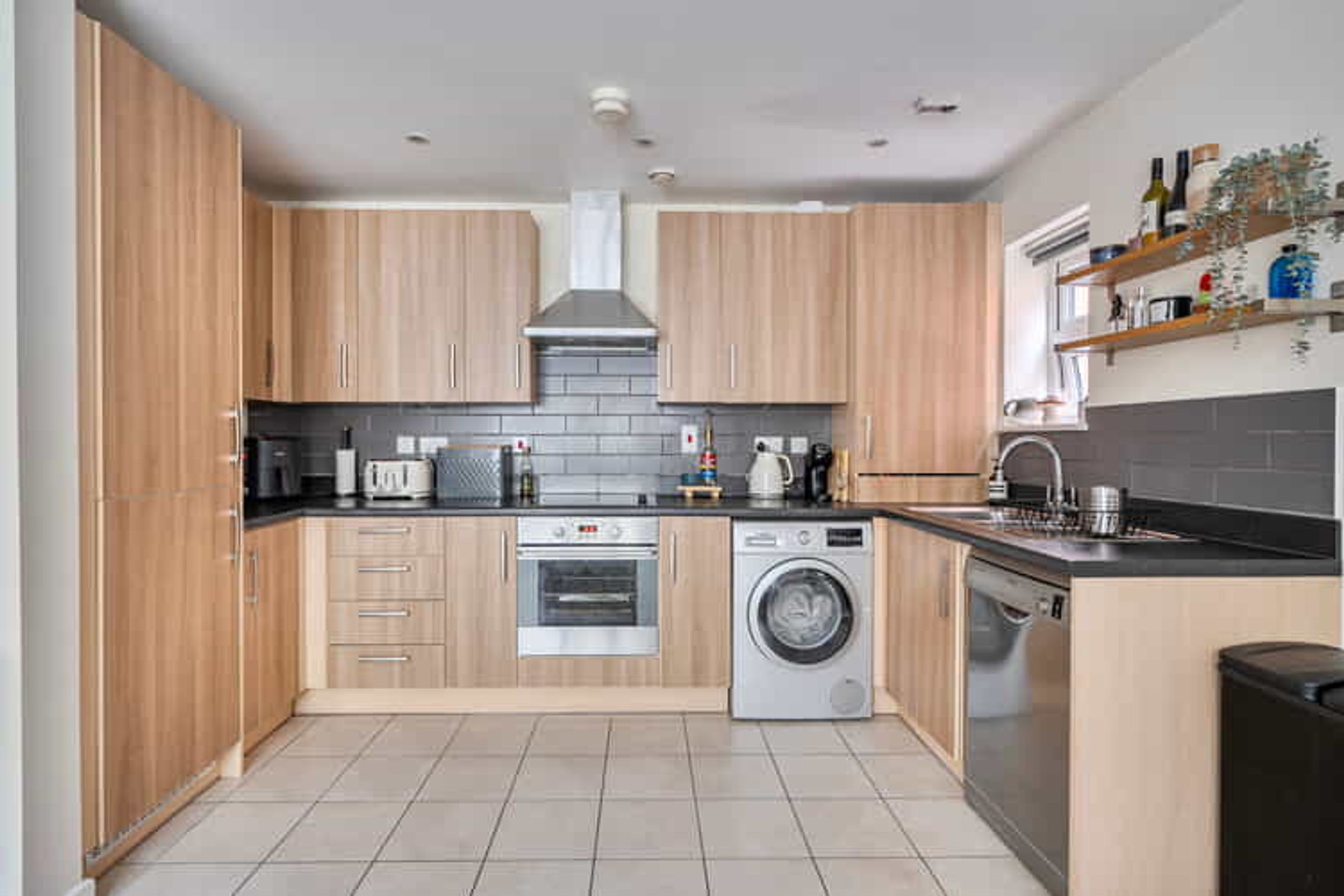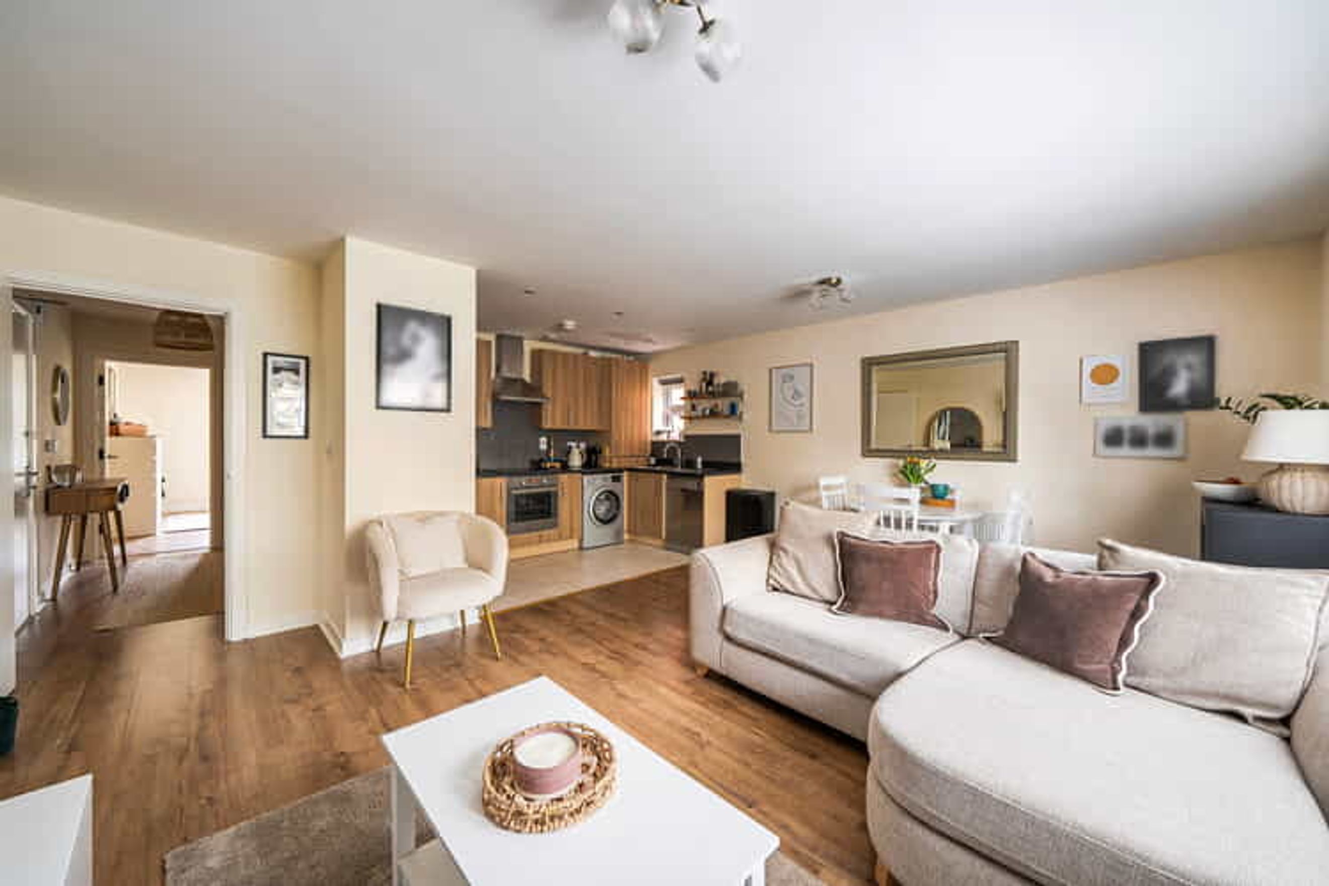 The property on the ground floor comprises an entrance hall with built in storage, a spacious living room with a modern open plan kitchen, two good sized bedrooms and a bathroom.