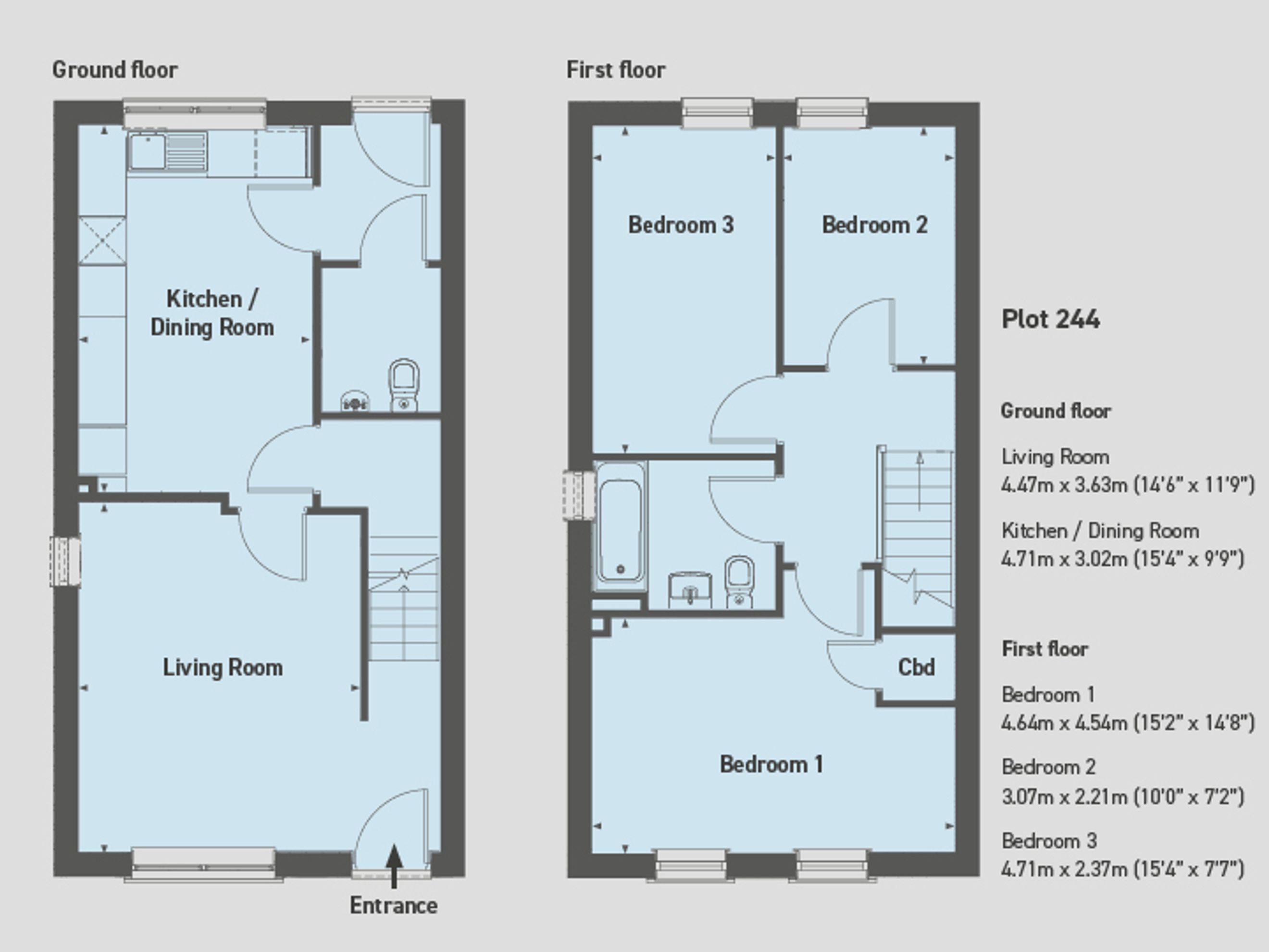 The three bedroom properties’ ground floor comprises a separate kitchen/dining room, living room and cloakroom with handbasin and WC. Upstairs are two double bedrooms, a family bathroom and a third, single bedroom which could also serve as a home office.