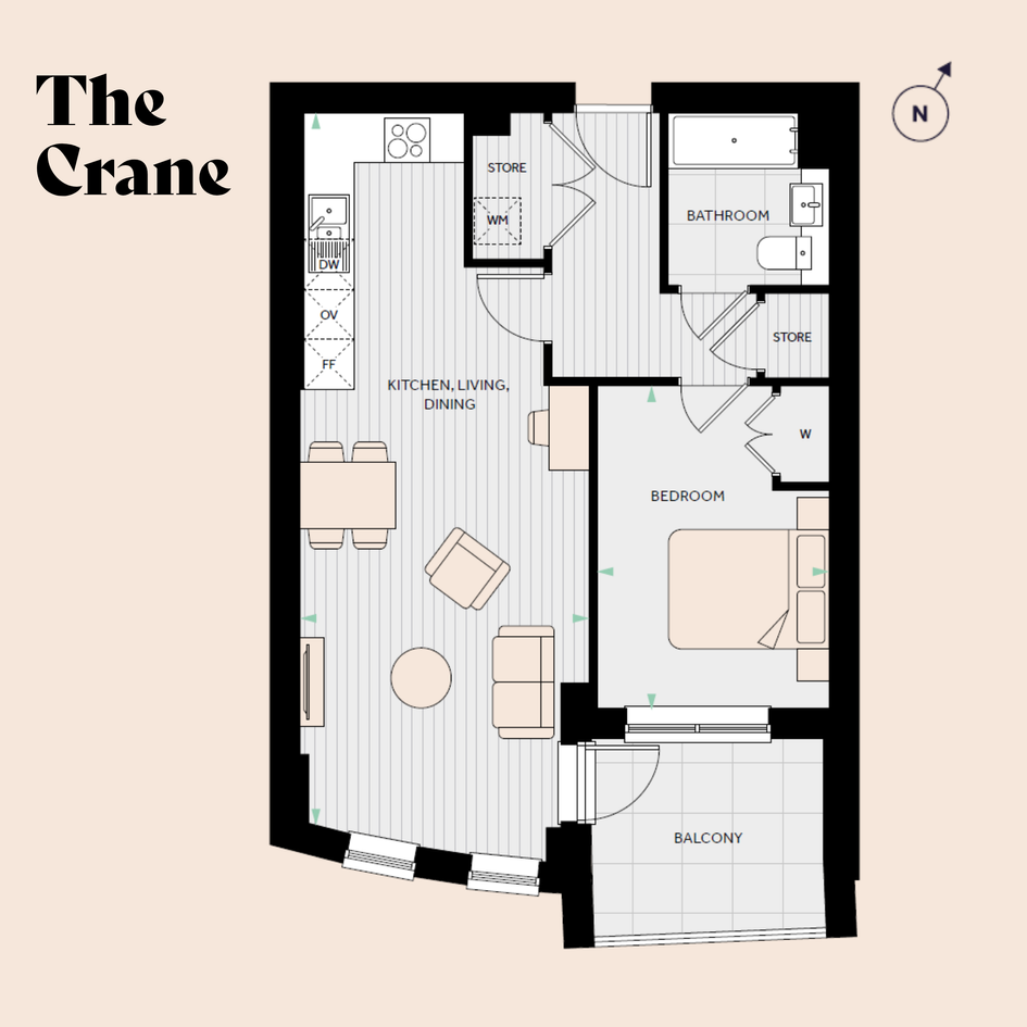 The final one-bedroom apartment at The Hue presents a rare opportunity to secure a stylish, move-in-ready home in the heart of Hounslow, with deposits starting from £5,819. Offering 54 sqm of thoughtfully designed living space, this bright home features a spacious open-plan kitchen, living and dining area, complemented by large windows and a south-facing private balcony. The bedroom includes a built-in wardrobe, with added touches such as fitted curtains and wall art enhancing the finish. With underfloor heating throughout, integrated Bosch appliances, Hyperoptic broadband availability and generous storage, this apartment combines comfort, convenience and contemporary design.