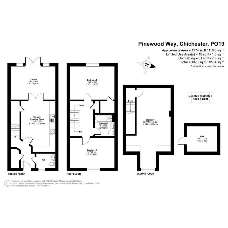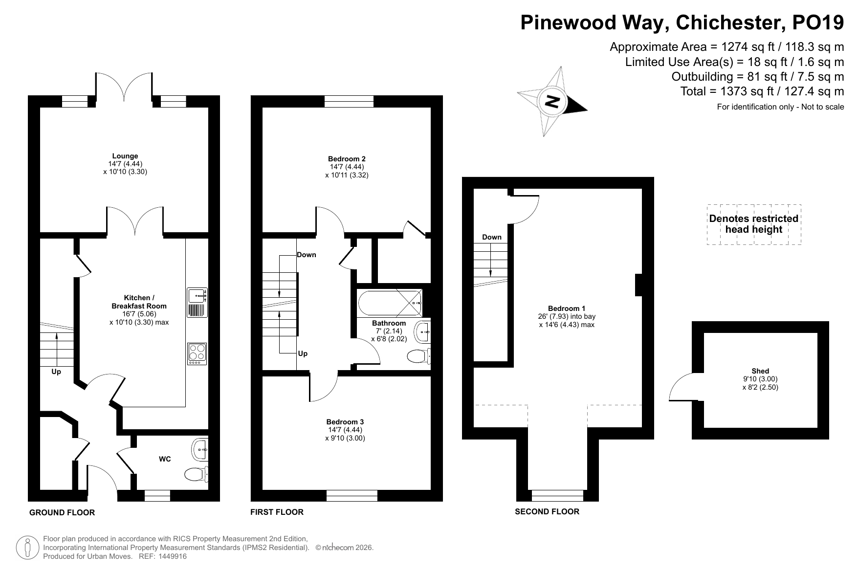 This recently-built and well-presented home provides more than twelve hundred square foot of accommodation, arranged over three floors. The property has a cloakroom/WC just off the entrance hall, a central kitchen/dining room and a reception room at the rear. Double doors lead out to a garden with patio, lawn and timber shed. On the first floor of the house are two very-similar-sized bedrooms and the bathroom. Further upstairs, on the top floor, is a very spacious main bedroom. Demanding insulation standards, high performance glazing and a communal heating and hot water system all contribute towards a very good energy-efficiency rating. Pinewood Way is part of the extensive Graylingwell Park development on the semi-rural outskirts of Chichester. Nearby Havenstoke Park offers beautiful, green space to enjoy as well as the popular Pavilion Cafe. The property comes with use of an allocated parking space and the shops and other amenities of the city centre can also be easily reached by bike.