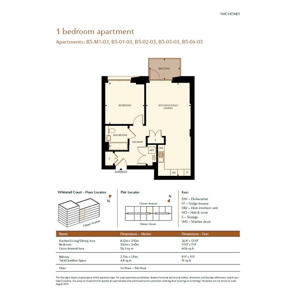 Plot B5-04-03: set on the fifth floor, this one bedroom apartment offers a definitive entrance hallway with generous storage before leading onto the open-plan living/dining/kitchen area (complete with selected appliances). This space offers the perfect opportunity for flexible zoned living to suit your lifestyle with access to your private balcony. The contemporary main bathroom is well proportioned and comes complete with a heated towel rail and useful storage shelving. The main bedroom is of a generous size and offers plenty of space for storage.